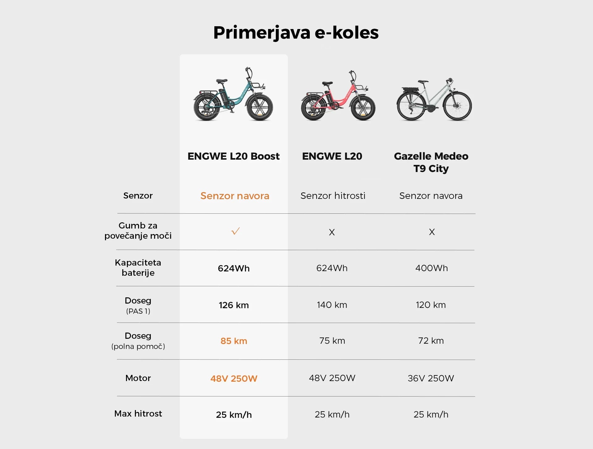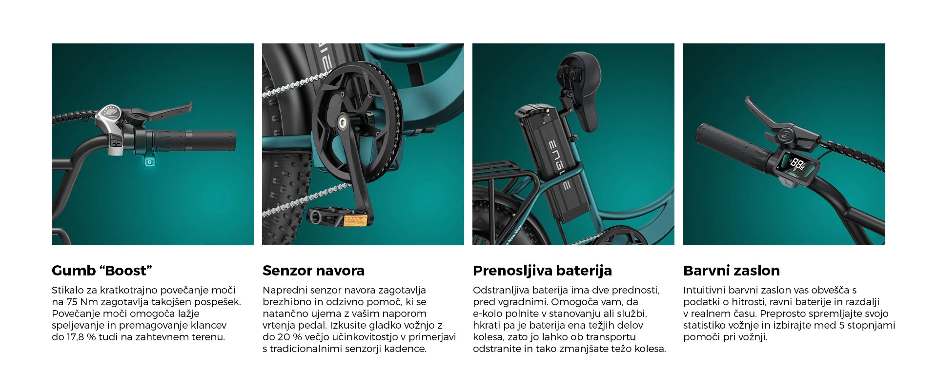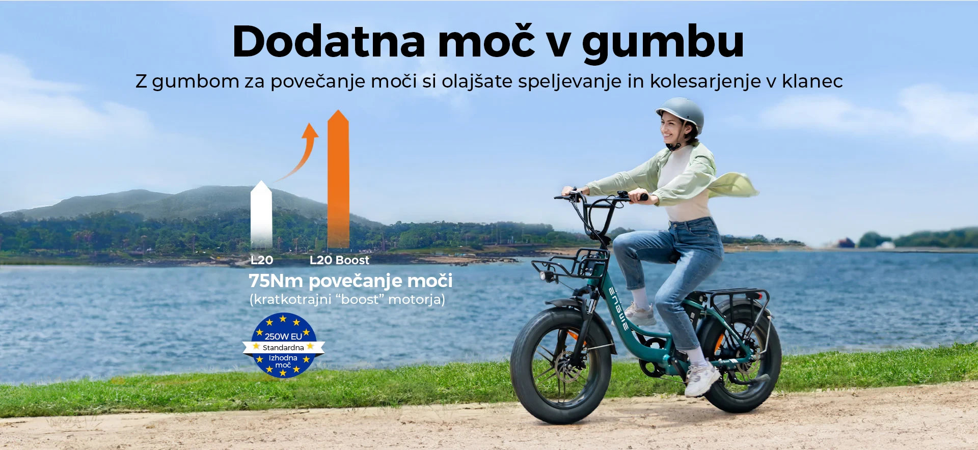 ENGWE L20 Boost je izjemno zmogljivo električno kolo, zasnovano za mestno vožnjo. Z gumbom "Boost" omogoča enostavno pospeševanje in vožnjo po strmih vzponih brez napora. Kolo je popolnoma legalno za uporabo v EU in Sloveniji, saj ustreza vsem predpisom. Z enim polnjenjem lahko dosežete do 120 km, kar omogoča dolge vožnje brez skrbi glede baterije. Barvni zaslon zagotavlja preglednost vseh ključnih informacij med vožnjo, vključno s hitrostjo, nivojem baterije in izbranim načinom vožnje. Poleg tega senzor navora prilagaja pomoč motorja glede na moč pedaliranja, kar izboljšuje učinkovitost in udobje med vožnjo.
